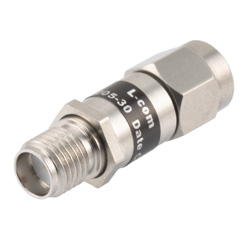 LCAT1005-30是L-com提供的30dB RF固定衰减器。 主体采用六角螺母设计(方便用力矩扳手安装),一端为SMA公头连接器,另一端为SMA母头连接器。 该零件有现货,当天发货。