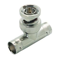 This 75 Ohm BNC 3 port T shape adapter allows routing of a signal from a common source to two different devices. The combination of two BNC jack interfaces and one BNC plug interface is useful for mating in many commonly found test applications.