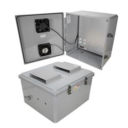 The box is a rugged weatherproof enclosure that is ideal for both indoor and outdoor applications. Constructed from High-Impact, UV Resistant Polycarbonate material that provides superior durability to impacts and ease of modification while maintaining minimum weight. It is well suited for high temperature or corrosive environments. The lid includes two vents with installed rain guards and filters. The included wall mount brackets come uninstalled and bagged with their hardware inside of the enclosure. Once the brackets are installed the enclosure can be mounted directly to any flat wall surface provided proper screws are used into secure studs. The brackets, once installed, also allow you to use our HGX-PMT pole mount kits. The lid features a non-metallic hinge system that allows for quick removal & can be reattached just as quickly without the need for any tools. The enclosure comes with a pair of stainless-steel latches with padlock eyes allowing you to secure the enclosure from tampering. The enclosure comes in a Dark Gray (Pantone 422C) Mounting Plate The aluminum mounting plate included with the NBPC181610-10FSX features standard surge protected duplex 120 VAC outlets and a terminal block for easy hook up to externally provided line power. The enclosure also features holes for two N-Bulkhead lightning protectors or connectors, a grounding lug and cable conduit connector. Cooling To help ensure trouble-free operation of electronic equipment, proper operating temperatures inside an enclosure needs to be maintained. With the built-in dual cooling fans, internal temperatures can be better maintained. This model is ideal in hot environments. The “Power Saver” feature is designed to reduce electrical usage as well as extend the life of the fans which are controlled by our exclusive dual fan solid state controller. The relays provide independent control for each of the fans with two different turn-on temperatures. The relays also feature Zero Cross Detection for EMI reduction. For Cooling the NBPC181610-10FSX comes with two independently controlled 120 VAC 16.4W (32.8W total) cooling fans installed. The high airflow, low noise fans used allow warm air to be actively pushed out the top vent while the second fan on the lower vent (when it turns on) actively pulls in outside air into the enclosure. Filters for both ports prevent foreign objects or debris from entering the enclosure. The controller features improved temperature set point accuracy. The top fan has a turn-on temperature of 90° F (32° C). If the temperature continues to climb to 100° F (38° C), the lower fan turns on. When the temperature drops back to 91° F (33° C), the lower fan turns off. When the temperature drops to 81° F (27° C), the top fan turns off. The dual fan power saver design offers energy efficiency. The cooling fans do not require the use of any of the AC outlets, leaving them all available for your equipment. The HGX-PMT series of pole mounting kits allow the populated enclosure to be securely mounted to a variety of different size poles. Compatible versions include HGX-PMT13, HGX-PMT16, HGX-PMT28, HGX-PMT29, HGX-PMT30 & HGX-PMT33 附件