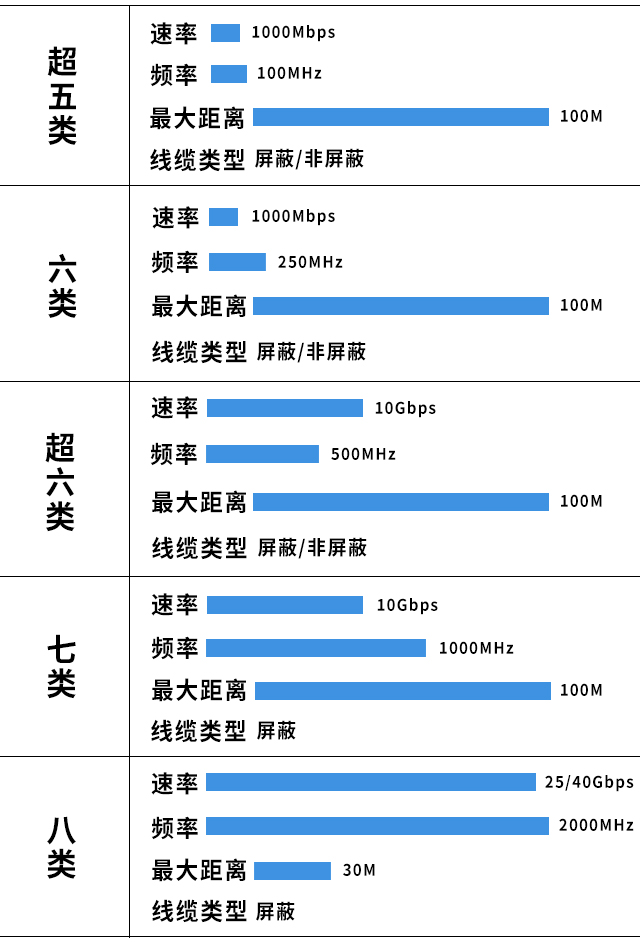 由上表可以看出,Cat8 八类网线和七/超七类网线一样,都属于屏蔽型双绞线,能应用于数据中心、高速和带宽密集的地方,虽然Cat8 八类网线的传输距离不如七类/超七类网线的远,但是它的速率和频率却是远超于七类/超七类网线。