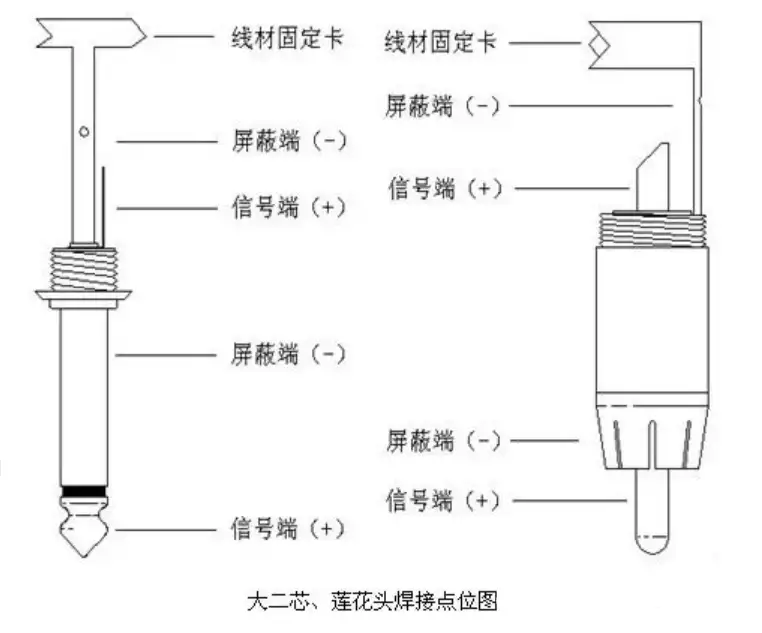 焊接前请将大二芯和莲花头的保护弹簧、底盖、护套套在线材上,以免焊接好后无法套上插头的底盖。具体焊接点位如下(图13):