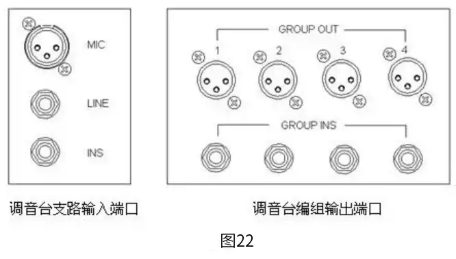 在一套专业音响系统中音频信号是通过调音台进行混合后分配给其它的周边处理设备进行各种相关的处理。通常情况下信号通过平衡的卡侬(MIC)或非平衡的线路(LINE)接口及返回(RETURN,二芯非平衡)接口进入调音台,在调音台混合后再通过总输出(ST / L、R / MIX / MAIN)、辅助输出(AUX SEND)、编组输出(GROUP OUT)等接口将音频信号传送出入。
