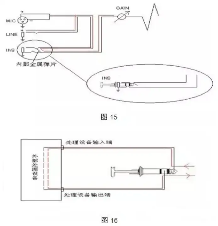 上述接口都是独立的输出或输入接口,在调音台上还用一种将输出、输入集为一身的接口,这种接口旁都有“insert”(读“因斯特”)或“ins”(读“因斯”)字样因此称之为“insert”或“ins”接口。通过调音台的ins接口我们可以任意给一个或几个不同的音频信号进行不同的处理。ins接口为大三芯接口,从调音台前端信号流程(图15、16)我们可以很直观的了解ins接口是怎样通过大三芯插头实现输入和输出的。本文将围绕这一接口的制作进行简要解析。