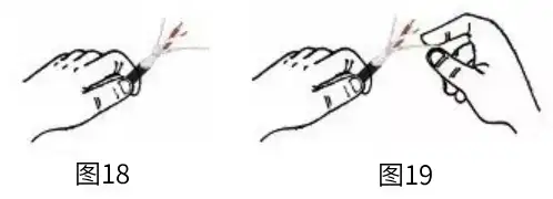 insert线另一端的剥线要复杂一些。将线材的另一端的外部橡胶护套层去除20厘米左右后剪去棉纱填充物再用剥线钳或偏口钳在距每根芯的0.5厘米处去除每根芯线的护套层露出铜质内芯(图18),在将屏蔽层一分为二分别用手拧扎结实(图19)。