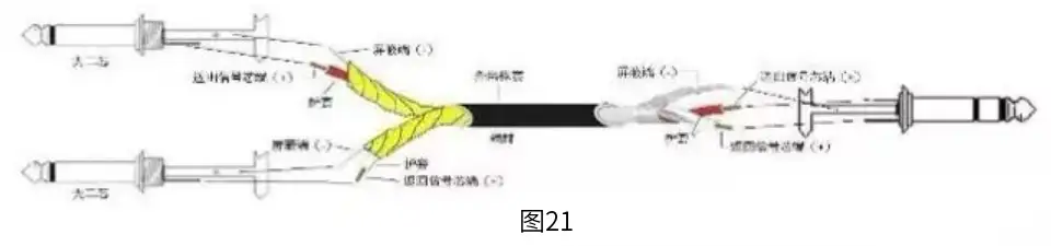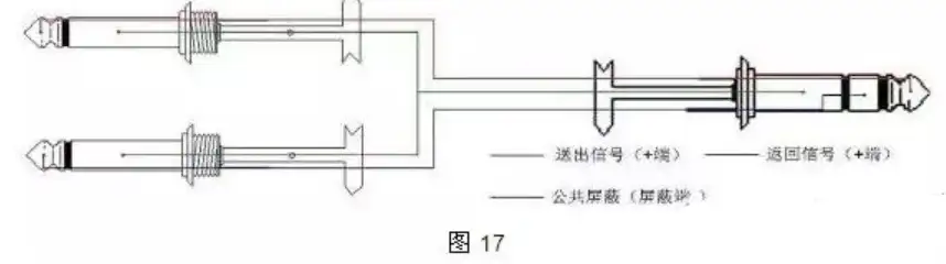 从图16中可以看到ins接口无插头时信号无论是从MIC或LINE输入到调音台后通过增益(GAIN)调节再向后传送(红色标线),当大三芯插头插入后将ins接口内部金属弹片顶起便形成了断路。图17中显示形成断路后大三芯的前端将调音台的信号送出给外部设备进行处理,处理设备将处理完毕的信号通过大三芯的中端又返回到调音台中通过增益调节再向后部传送(红色标线)。从图15、16中可以看出insert线其实就是一根一端为大三芯另一端分成两个大二芯的线(图17)。