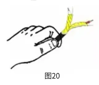 完成分线后再用绝缘胶布(或热缩管)将每根芯和一根批开后的屏蔽缠绕包裹形成两根两芯的线,即每根均由一根芯和一根屏蔽组成。(图20)。