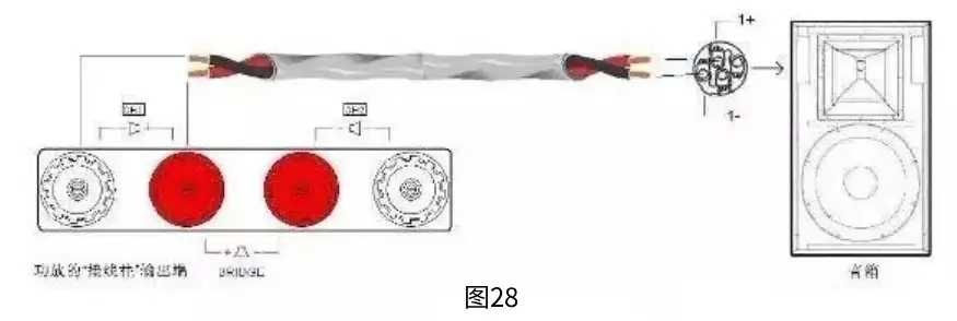 这种音箱线是如何连接功放与音箱得呢?下图以左声道信号(通常功放的CH1或A通道连接立体声信号的左声道)为例演示如何连接(图28)。