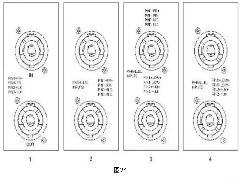图24中1、2为内置分频、4为外置分频、3则两种方式都可以。图24中1、2标注“PIN1+FR+/PIN1-FR-、PIN2+N.C+/2-N.C-”意思为: “NEUTRIK”4个芯中“1+”端为信号“+”、“1-”端为信号“-”,“2+、2-”为空(N.C)。图24中4标注“PIN1+LOW+/PIN1-LOW-、PIN2+H.M+/2-H.M-”意思为:“NEUTRIK”4个芯中“1+”端为LOW(低音)信号“+”、“1-”端为LOW(低音)信号“-”,“2+”端为H.M(中高音)信号“+”、“2-”端为H.M(中高音)信号“-”。图24中3表示着两种方式都可使用。音箱的输入端口除“NEUTRIK”外还有“压线卡”式(如EV的EVID系列、TANNOY的i5/i7/i9等音箱),他们虽然形式不同但道理一样,只是后两种形式不用在音箱线上安装“NEUTRIK”头直接刨线后该卡得卡该拧得拧罢了。