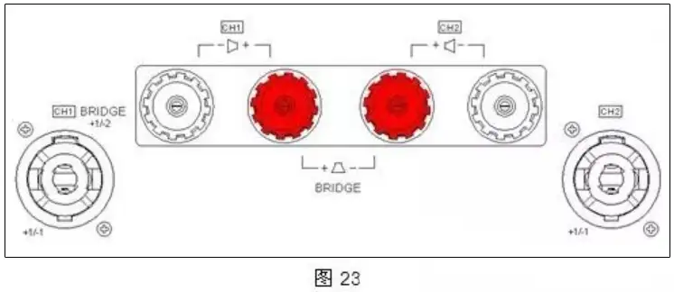 图23是一台常用功放的输出部分面板图。其中,中间部分为“接线柱”输出,两侧为“NEUTRIK头”输出。有些功放为了方便用户使用同时提供两种接线方式。无论是“接线柱”输出还是“NEUTRIK头”输出都有CH1 / CH2(有的功放标注为A / B)及“+、-”的标注,此标注说明该功放具有两个输出通道,每个通道的信号又有“+、-”之分。在前面介绍“NEUTRIK插头”时说过这种插头有2芯、4芯、8芯之分,功放输出端的“NEUTRIK”输出均为4芯,但只接其中2芯。在通常状态下和“非桥接(BRIDGE)”状态下功放的“NEUTRIK”输出端口输出的点位为“+1、-1”也有其它点位的如“+2、-2”。因此,在用“NEUTRIK”输出时请查看功放输出端的提示。
