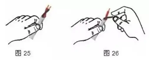 取适当长度的音箱线一根距一端3厘米除剥去外部护套层(图25)。距每芯顶端0.5厘米处去除护套露出铜芯,再将每芯分别拧扎结实(图26)。